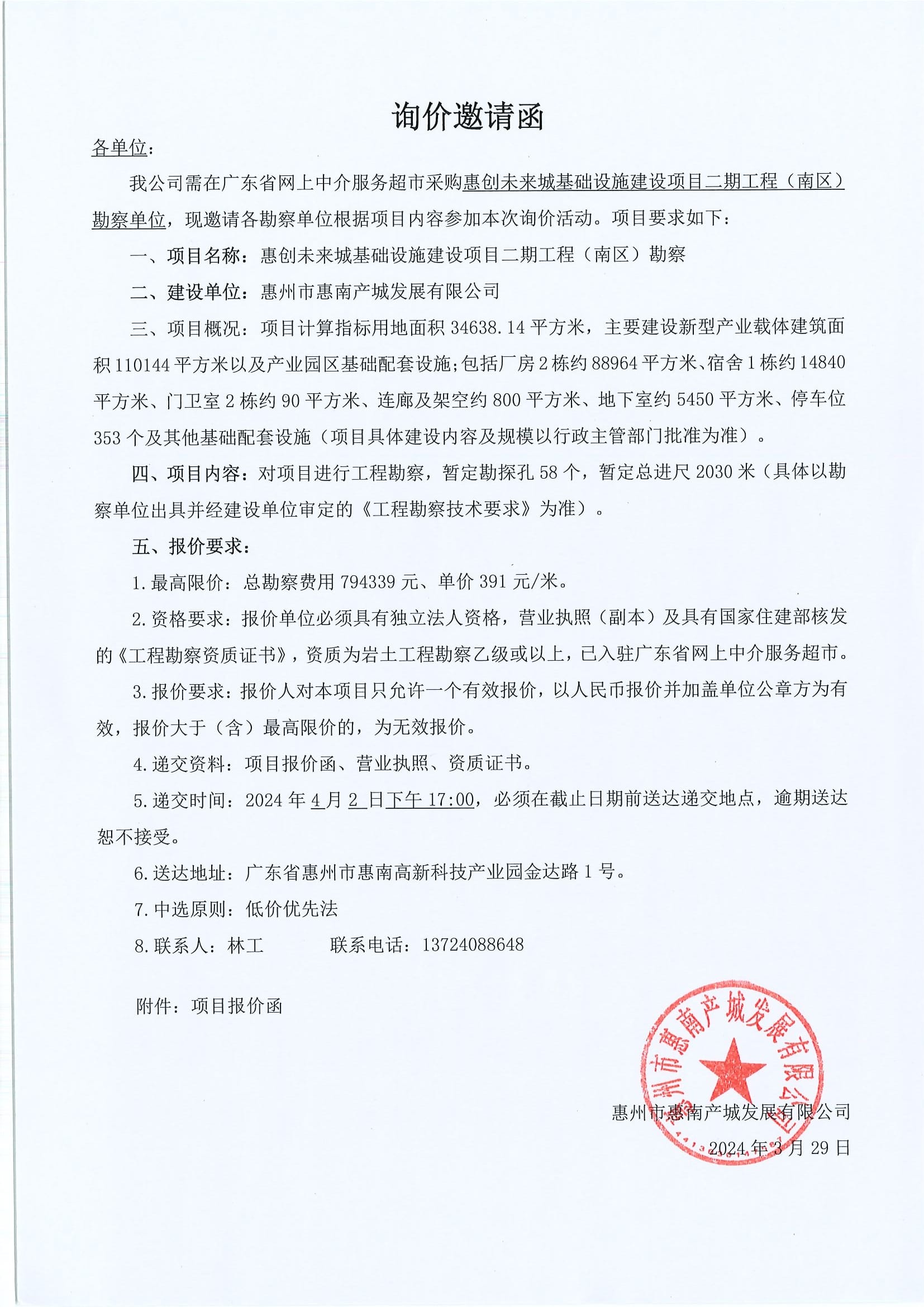 惠創(chuàng)未來城基礎設施建設項目二期工程(南區(qū))勘察詢價邀請函