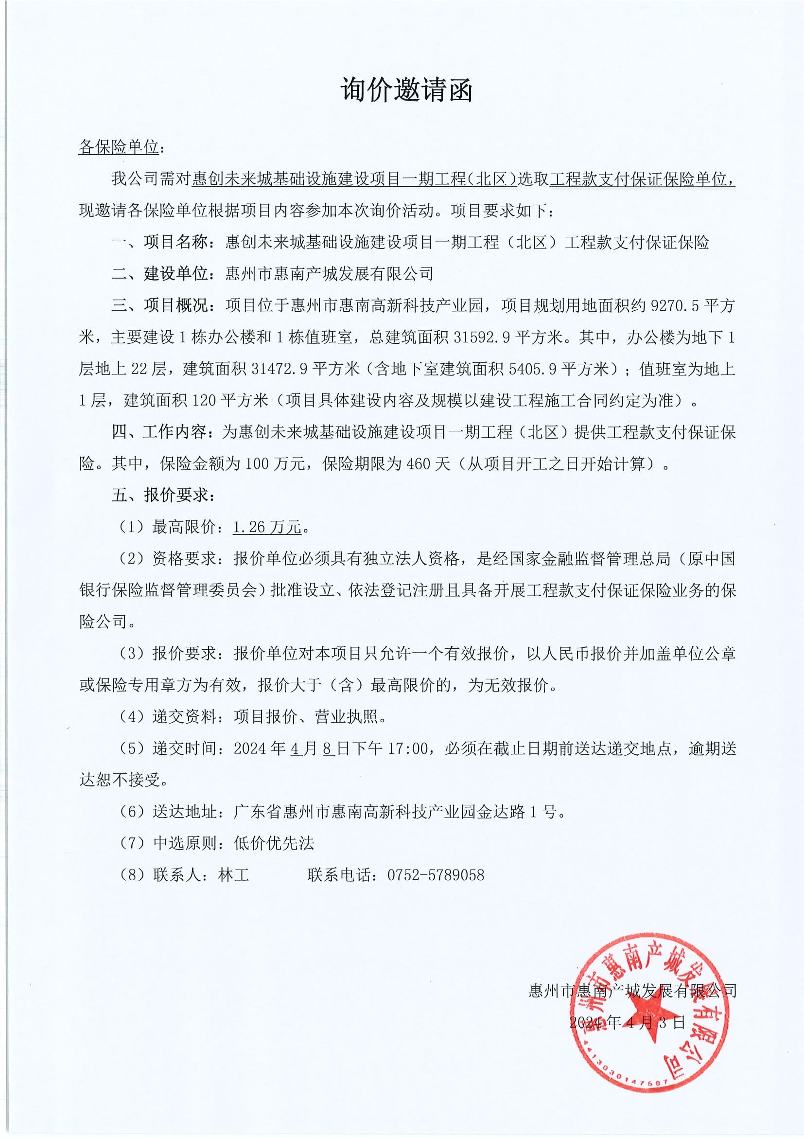 惠創(chuàng)未來城基礎(chǔ)設(shè)施建設(shè)項(xiàng)目一期工程(北區(qū))工程款支付保證保險(xiǎn)詢價(jià)邀請(qǐng)函