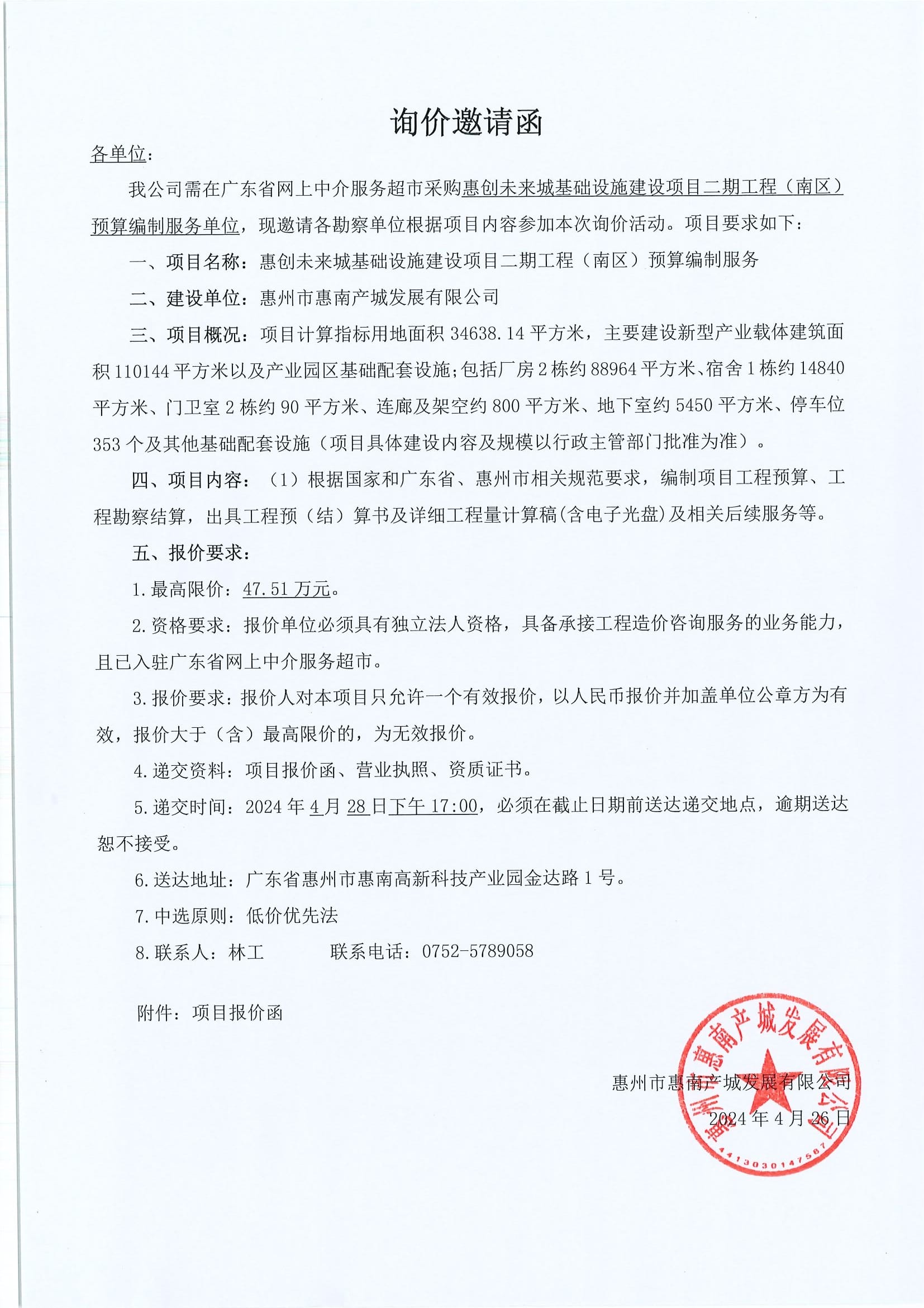 惠創(chuàng)未來城基礎(chǔ)設(shè)施建設(shè)項(xiàng)目二期工程(南區(qū))預(yù)算編制服務(wù)詢價邀請函