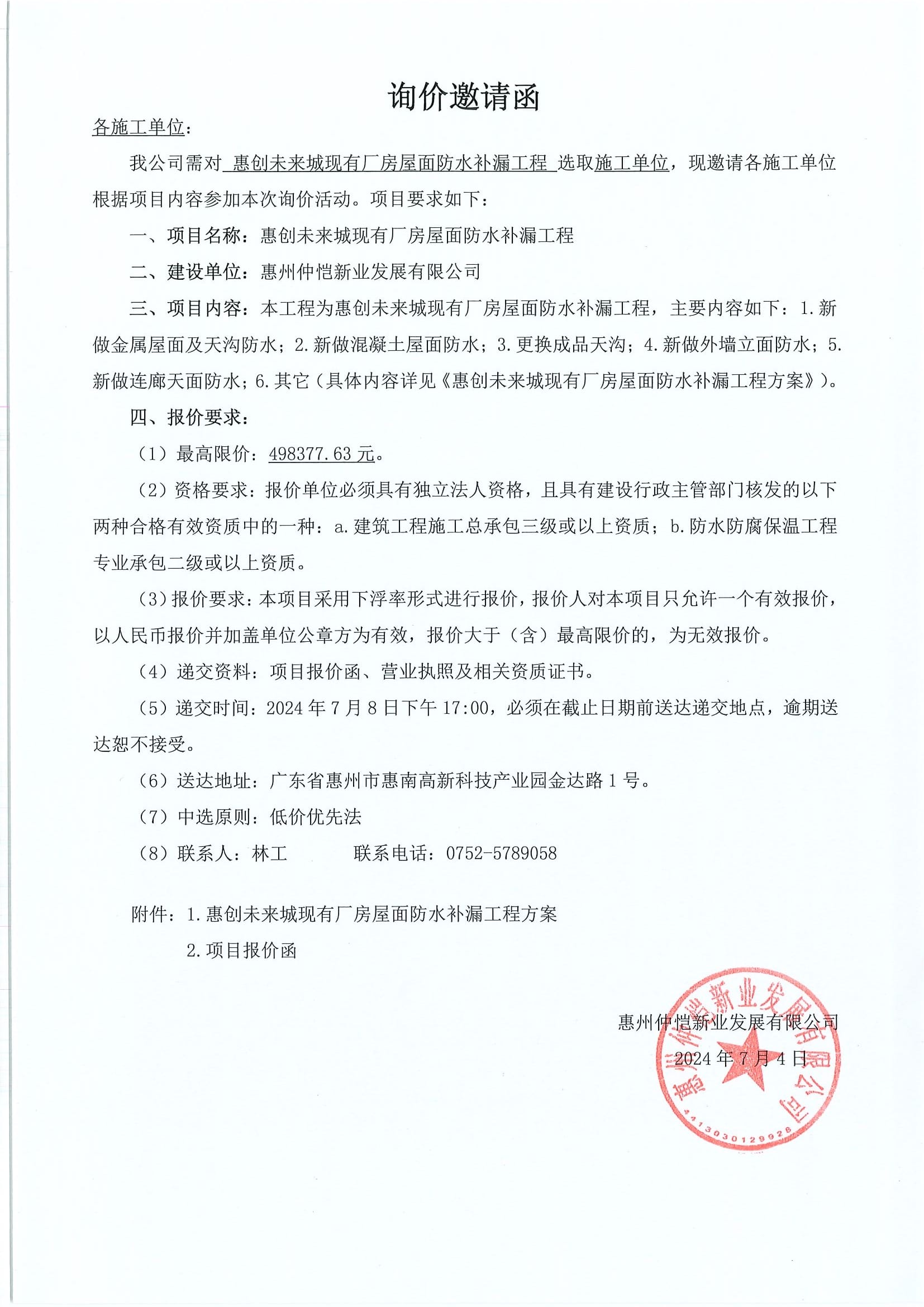 惠創(chuàng)未來(lái)城現(xiàn)有廠房屋面防水補(bǔ)漏工程詢(xún)價(jià)邀請(qǐng)函