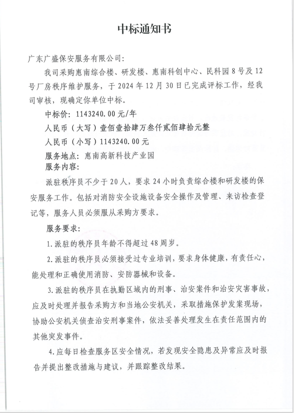 【中標(biāo)通知】采購惠南綜合樓、研發(fā)樓、惠南科創(chuàng)中心、民科園8號及12號廠房秩序維護(hù)服務(wù)