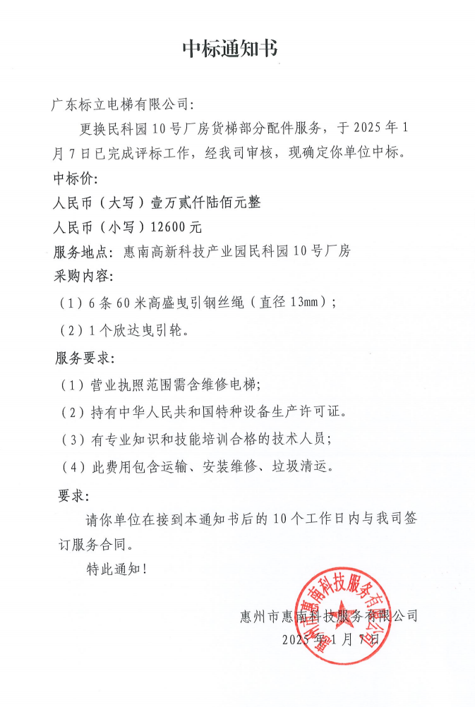 【中標通知】更換民科園10號廠房貨梯部分配件服務(wù)