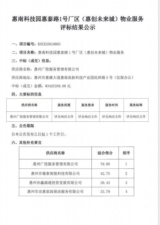 惠南科技園惠泰路1號廠區(qū)(惠創(chuàng)未來城)物業(yè)服務(wù)評標結(jié)果公示