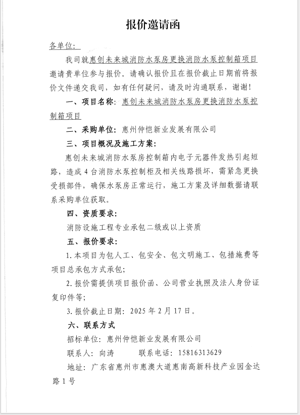 【中標(biāo)通知書】惠創(chuàng)未來城廠區(qū)水泵房柴油泵及配套設(shè)施維修項(xiàng)目