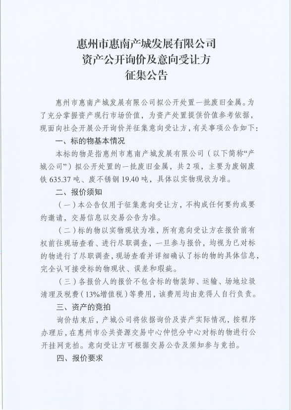 【招標(biāo)公告】惠州市惠南產(chǎn)城發(fā)展有限公司 資產(chǎn)公開詢價及意向受讓方征集公告