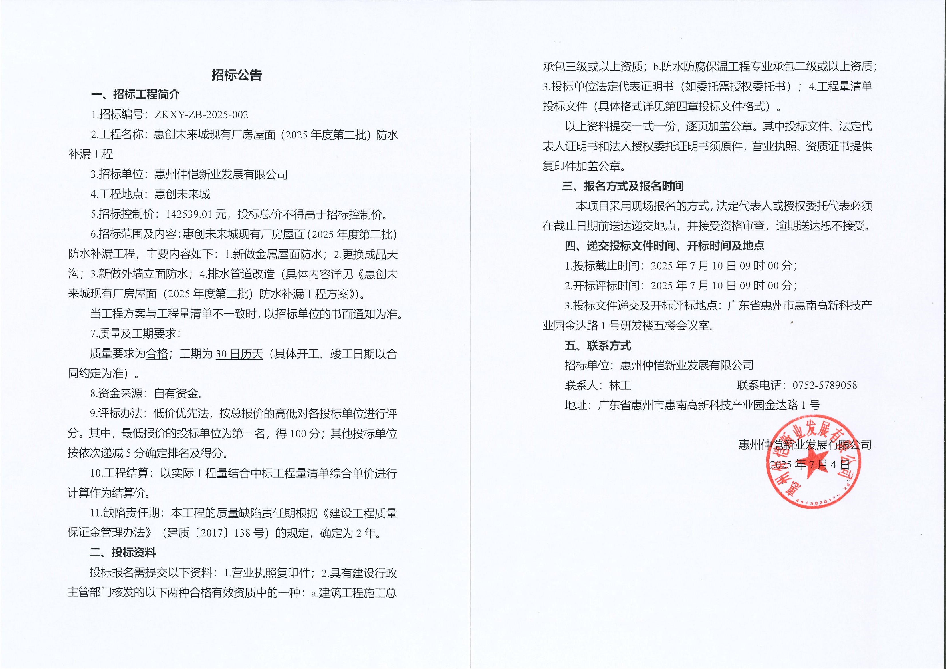【招標公告】惠創(chuàng)未來城現(xiàn)有廠房屋面(2025年度第二批)防水補漏工程