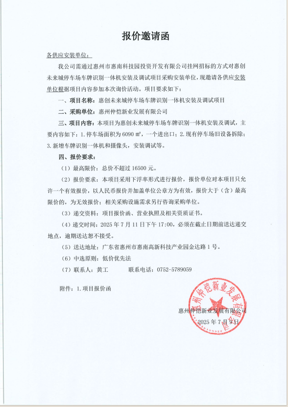 【報價邀請函】惠創(chuàng)未來城停車場車牌識別一體機安裝及調(diào)試項目采購安裝單位