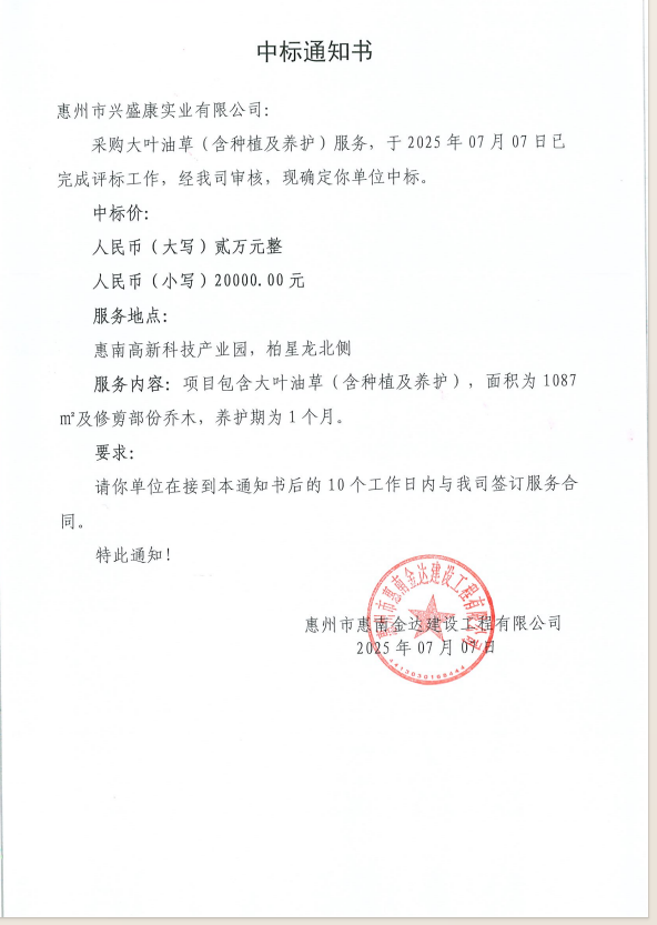 【中標通知】采購大葉油草(含種植及養(yǎng)護)服務(wù)