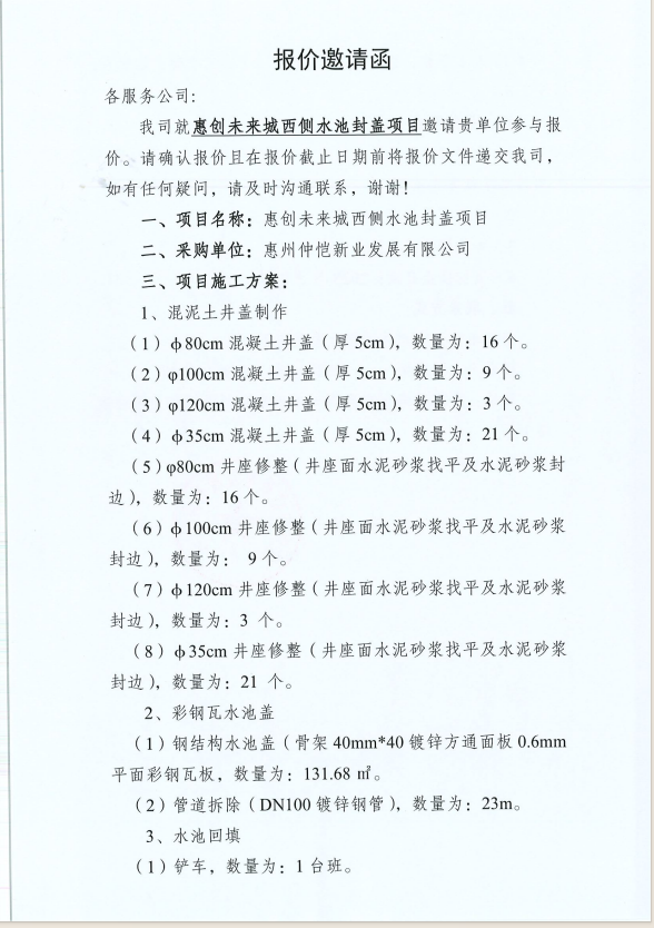 【報(bào)價(jià)邀請(qǐng)函】惠創(chuàng)未來(lái)城西側(cè)水池封蓋項(xiàng)目