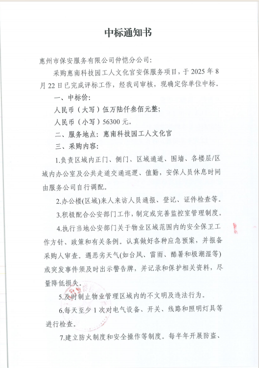 【中標通知】采購惠南科技園工人文化宮安保服務項目