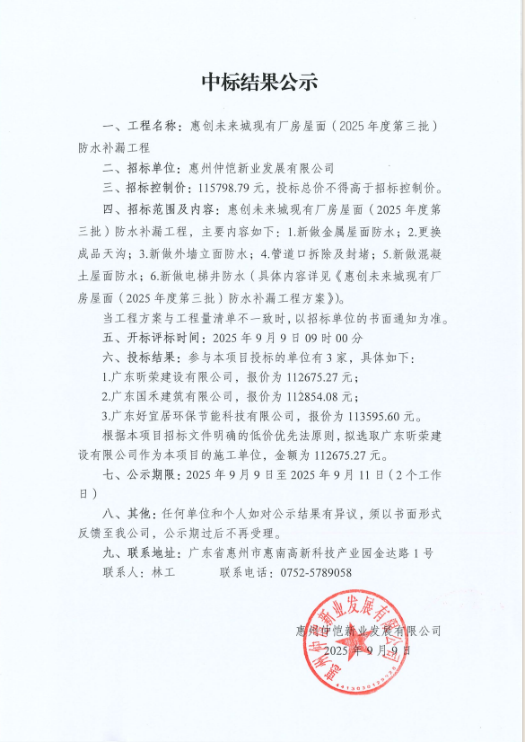 【中標結(jié)果公示】惠創(chuàng)未來城現(xiàn)有廠房屋面(2025年度第三批)防水補漏工程