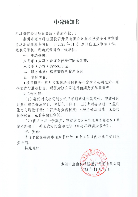 【中選通知】惠州市惠南科技園投資開(kāi)發(fā)有限公司股權(quán)投資企業(yè)前期財(cái)務(wù)盡職調(diào)查服務(wù)項(xiàng)目