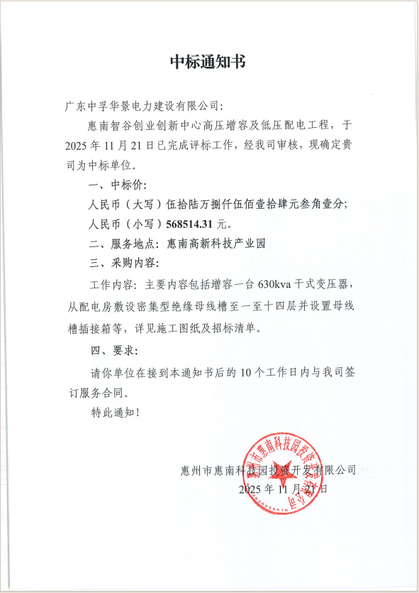 【中標通知】惠南智谷創(chuàng)業(yè)創(chuàng)新中心高壓增容及低壓配電工程