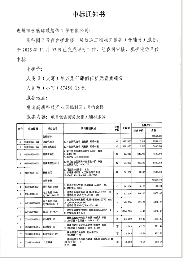 【中標(biāo)通知】民科園7號宿舍樓北樓二層改造工程施工勞務(wù)(含輔材)服務(wù)