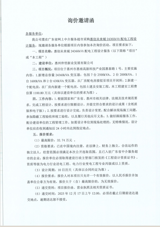 【詢價(jià)邀請(qǐng)函】采購(gòu)惠創(chuàng)未來(lái)城24360kVA配電工程設(shè)計(jì)服務(wù)