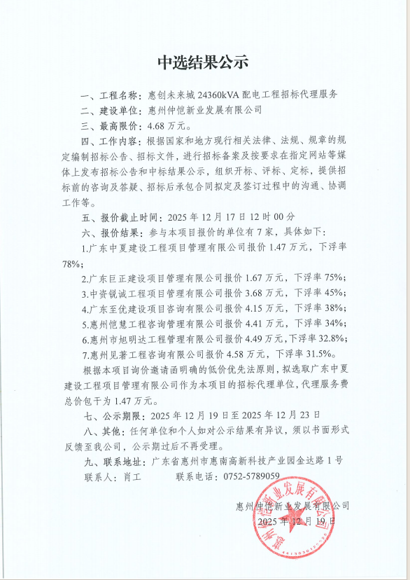 【中選結(jié)果公示】惠創(chuàng)未來城 24360kVA配電工程招標(biāo)代理服務(wù)