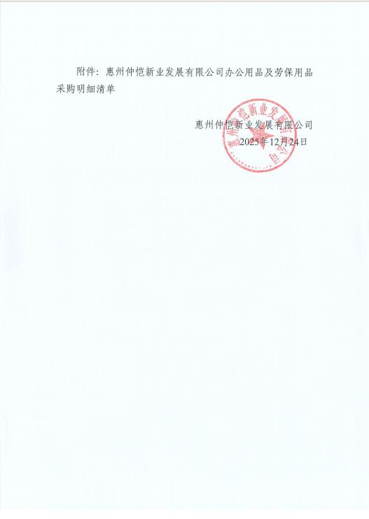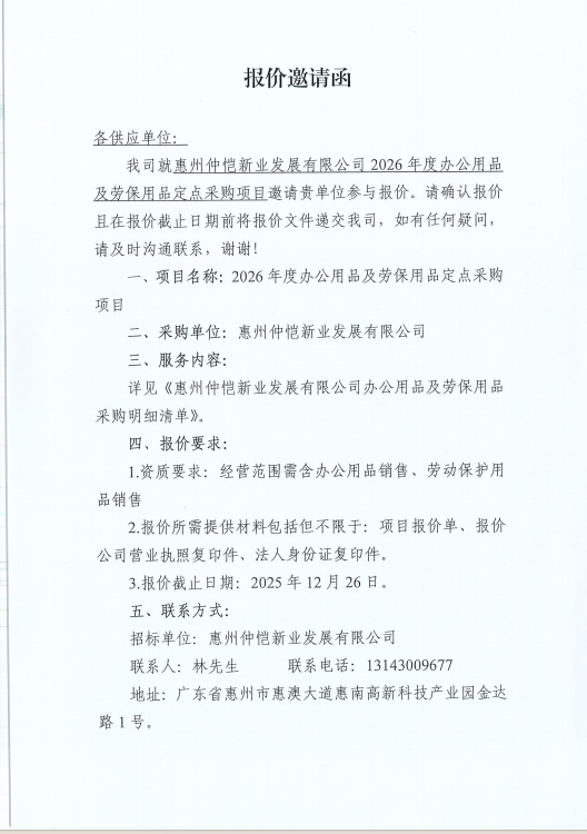 【報價邀請函】惠州仲愷新業(yè)發(fā)展有限公司2026年度辦公用品及勞保用品定點采購項目