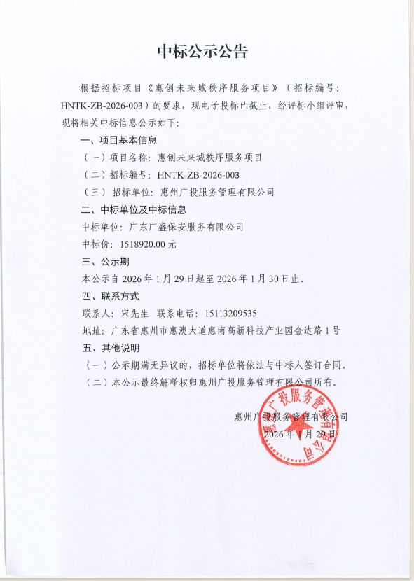 【中標(biāo)公示】惠創(chuàng)未來城秩序服務(wù)項(xiàng)目