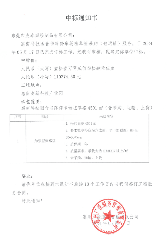 【中標(biāo)通知】惠南科技園含書(shū)路停車場(chǎng)植草格采購(gòu)(包運(yùn)輸)服務(wù)