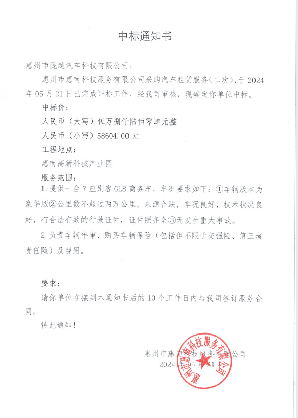 【中標(biāo)通知】惠州市惠南科技服務(wù)有限公司采購(gòu)汽車(chē)租賃服務(wù)(二次)