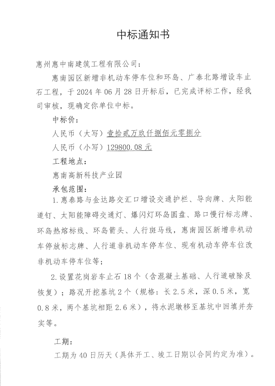 【中標(biāo)通知】惠南園區(qū)新增非機(jī)動(dòng)車停車位和環(huán)島、廣泰北路增設(shè)車止石工程
