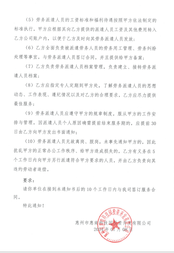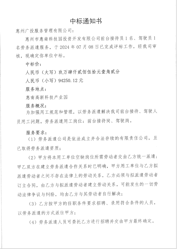 【中標通知】惠州市惠南科技園投資開發(fā)有限公司前臺接待員1名、駕駛員1 名勞務派遣服務