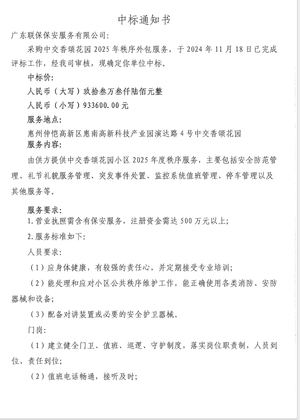 【中標通知】采購中交香頌花園2025年秩序外包服務
