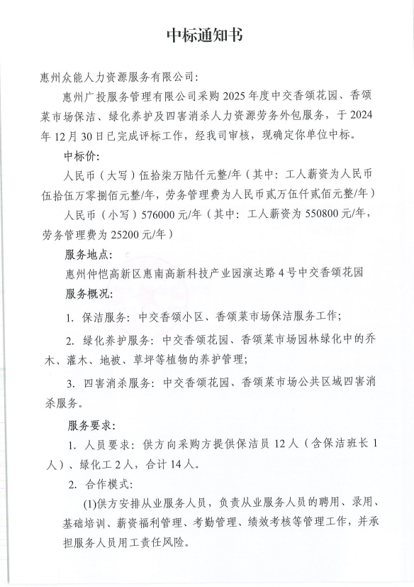 【中標(biāo)通知】采購2025年度中交香頌花園、香頌菜市場保潔、綠化養(yǎng)護(hù)及四害消殺人力資源勞務(wù)外包服務(wù)