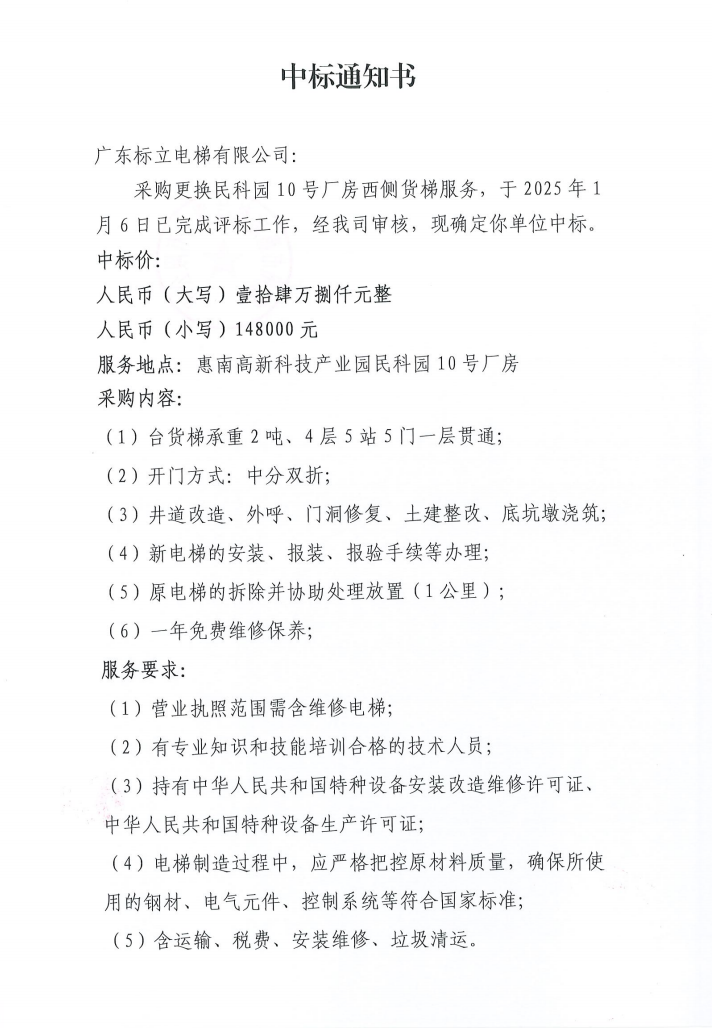 【中標(biāo)通知】采購更換民科園10號(hào)廠房西側(cè)貨梯服務(wù)