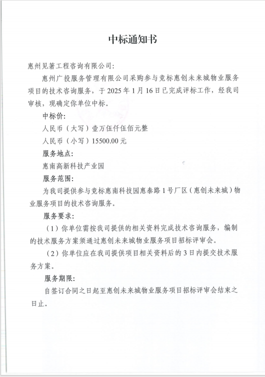 【中標(biāo)通知】惠創(chuàng)未來城物業(yè)服務(wù)項(xiàng)目的技術(shù)咨詢服務(wù)