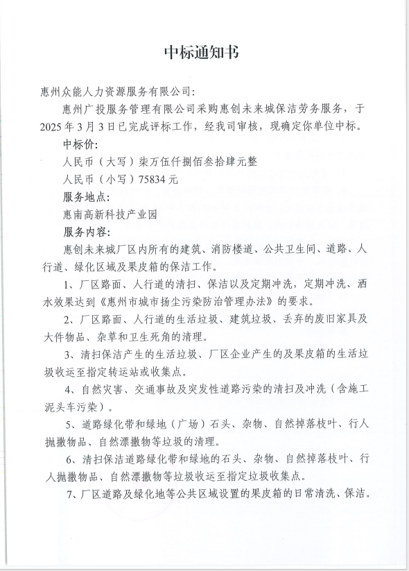 【中標(biāo)通知】采購惠創(chuàng)未來城保潔勞務(wù)服務(wù)
