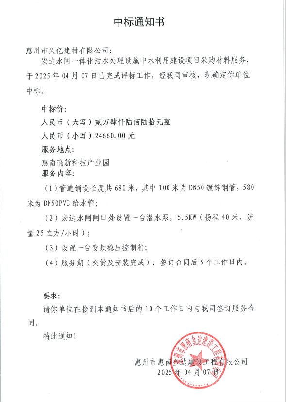【中標(biāo)通知】宏達(dá)水閘一體化污水處理設(shè)施中水利用建設(shè)項(xiàng)目采購(gòu)材料服務(wù)