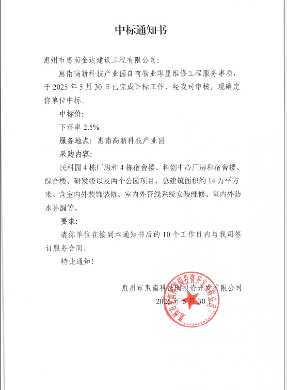 【中標(biāo)通知】惠南高新科技產(chǎn)業(yè)園自有物業(yè)零星維修工程服務(wù)事項(xiàng)