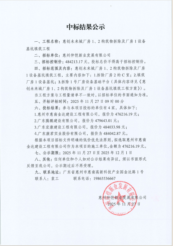【中標結(jié)果公示】惠創(chuàng)未來城廠房 1、2構(gòu)筑物拆除及廠房1設備基坑填筑工程